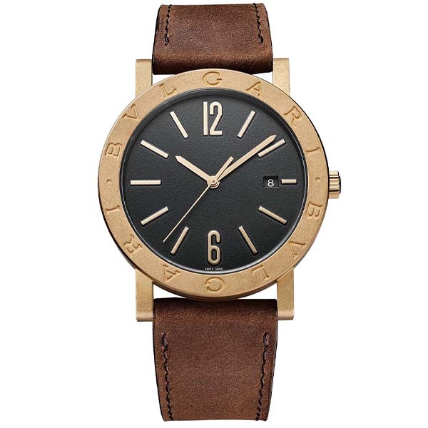 Featuring the highest skills of Swiss watchmaking - with the in-house manufactured movement – and combining it with the bold modernity of Italian design, the BVLGARI BVLGARI Solotempo watch blends classiness with perfect performance. The double logo, inspired by the curved inscriptions on ancient Roman coins, epitomizes still today Bvlgari’s unparalleled ability to reimagine its rich heritage into timeless creations. BVLGARI BVLGARI Solotempo watch with mechanical manufacture movement, automatic winding and date, BVL 191 - Solotempo caliber decorated with côtes de Genève, chamfering and snailed finishing, 41 mm bronze case, bronze bezel with logo, bronze crown with ceramic insert, transparent case back, black dial, hand-applied bronze indexes, brown leather strap and ardillon buckle. Water-resistant up to 50 metres.