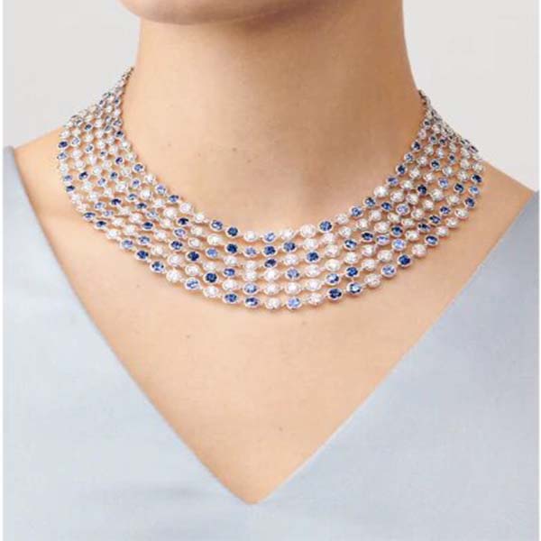Diamonds embrace the harmonious gradation of colored sapphires, sprinkled throughout the creations in a seemingly random way, creating an iridescent. The fluid lines of this ensemble recall this time the enchanting sight of the sea under the moving sun. Each stone represents a drop of water, evoking the spray of the waves.