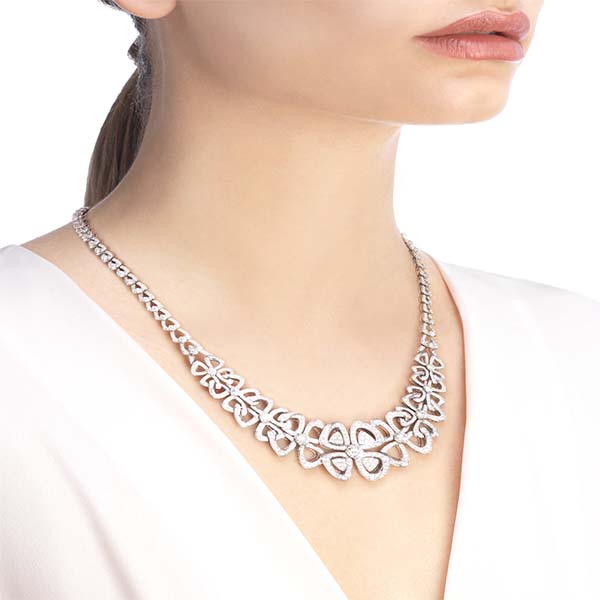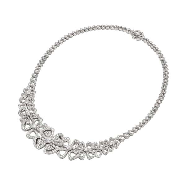 Blossoming between the marvellous monuments of the Eternal City, Fiorever draws inspiration from the alluring four-petal flower that was cherished by the Romans as a symbol of happiness and joy. A blend of two meaningful words: Fiore - Italian for flower, and forever. Fiorever celebrates the Roman love for life with a free-spirited and passionate design. Designed to sparkle with an eternal glow, the precious floral icon is crafted with a corolla of the highest quality diamonds. Fiorever necklace in 18 kt white gold, set with round brilliant-cut diamonds (4.21 ct) and pavé diamonds (4.61 ct).